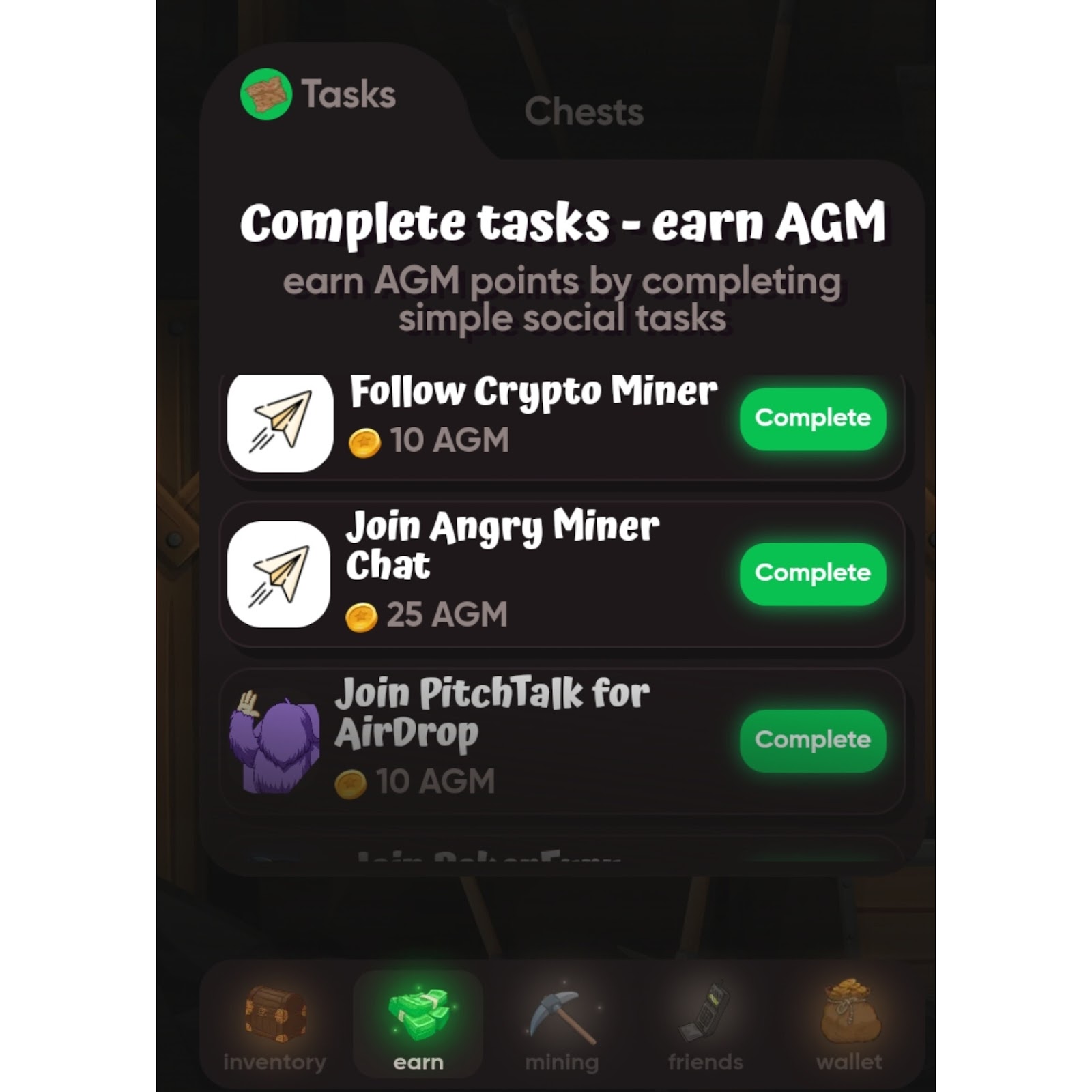 Изначально игрок получит 250 AGM. Их нужно конвертировать в токены USDT. Это получается 0,25 USDT. Далее для заработка нужно заходить в Телеграмм бота и в определенное время забирать новые монетки. Для того чтобы получить больше коинов, майнеры могут выполнять ежедневные задания. Например, за пополнение депозита на 10 долларов можно забрать 1 тыс. AGM. За подписку на тг чат можно получить 25 поинтов. За переход к проектам-партнерам начисляют по 10 коинов.
