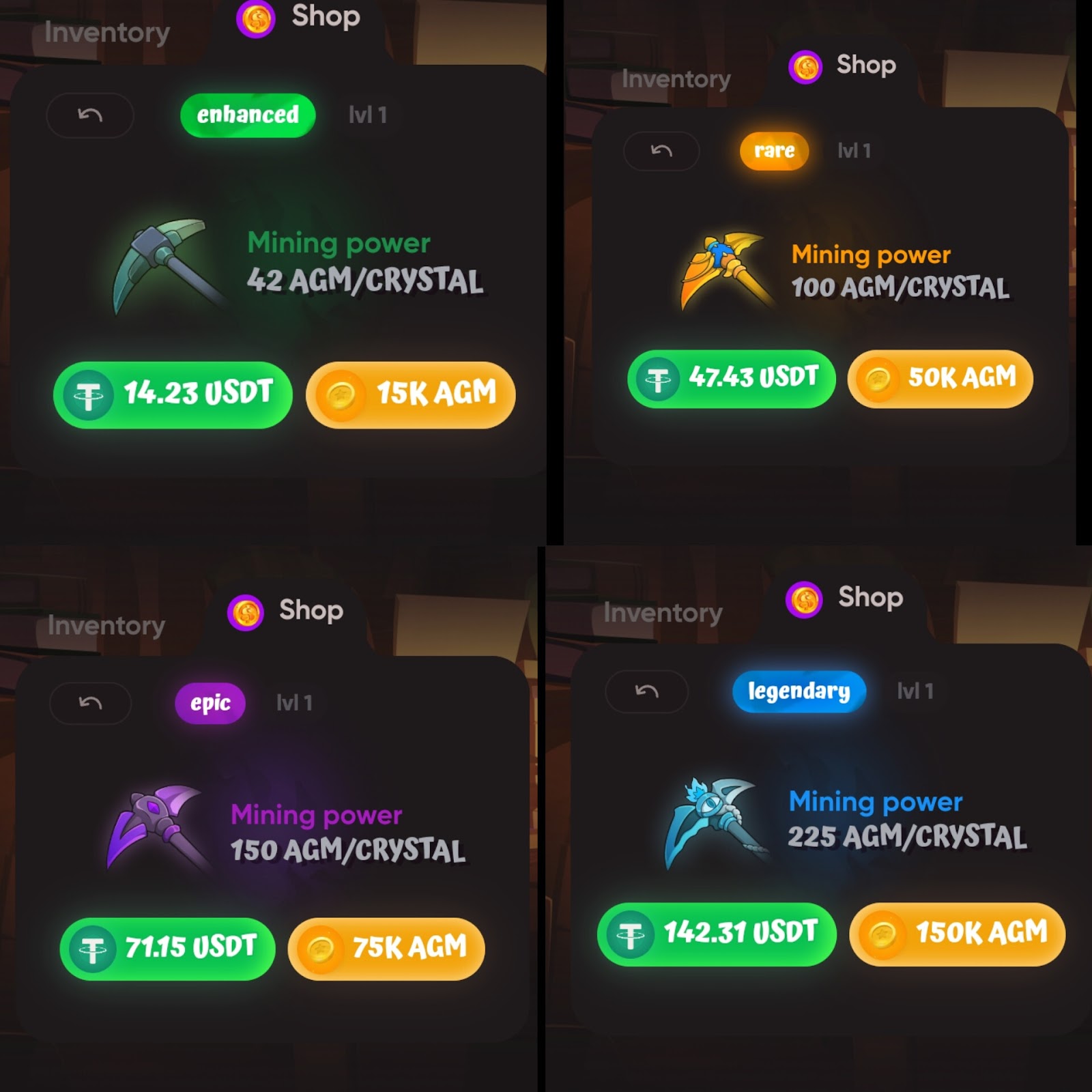 - “Legendary”. Продается за 142.31 USDT или 150k AGM. Можно получить 225 коинов.