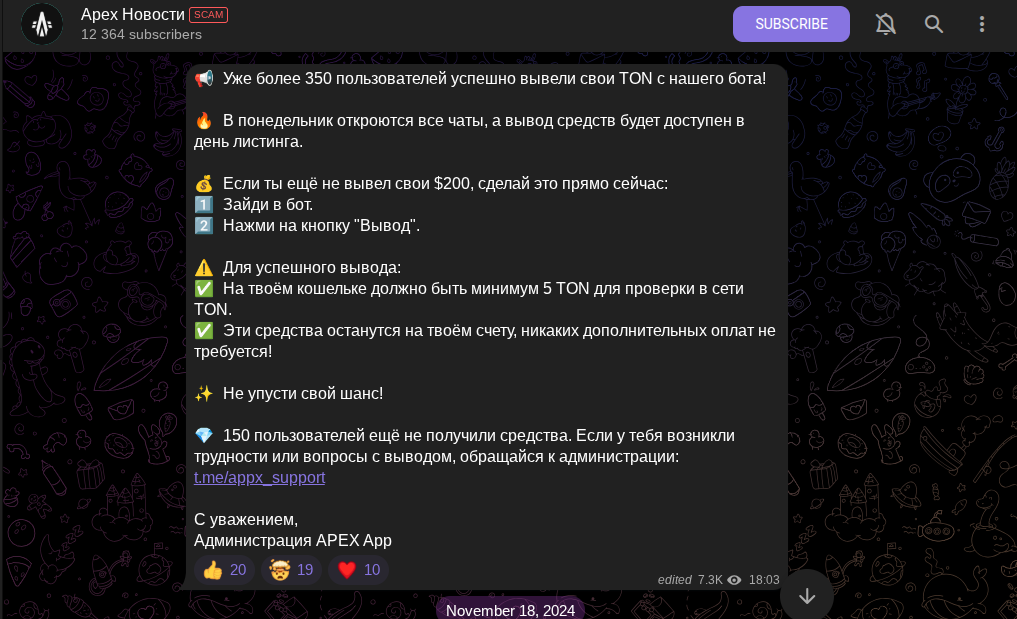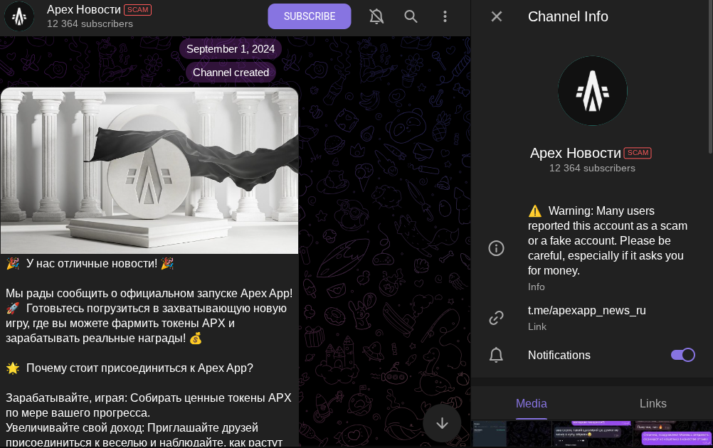 Как видно по скриншоту, к проекту был прикреплен резервный телеграм-канал. Мы открыли его и увидели, что паблик получил пометку SCAM, а это подтверждает отзывы о скаме Apex App. Более того, количество подписчиков снизилось до чуть больше 12.3 тысяч. Паблик существует с 1 сентября 2024 года, а значит можем предположить о старте бота в том же временном промежутке.