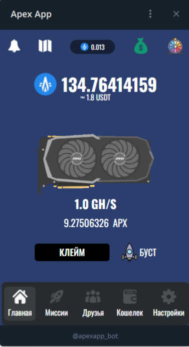 «Апекс Апп» — приложение на базе телеграма, которое предлагает как новичкам, так и опытным пользователям зарабатывать деньги на пассивной основе. Суть проекта в том, что каждый так сказать игрок запускает собственную ферму по добыче криптовалют. Дабы привлечь внимание аудитории, команда разработчиков использует известную базовую систему тапалок.