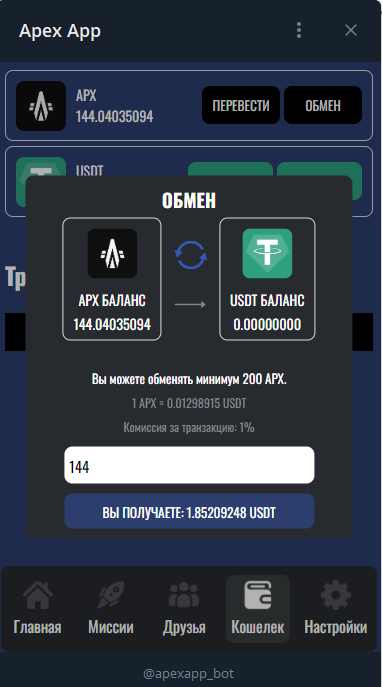 Отзывы от пользователей о скаме Apex App говорят, что каждому пользователю разработчики раздавали токены. Стоит отметить, что обменять можно от 200 APX на USDT + комиссия за транзакцию в 1%. Сделать это можно через раздел «Кошелек». Однако сразу после привязки создатели проекта «уводят» всю криптовалюту с криптохранилища.