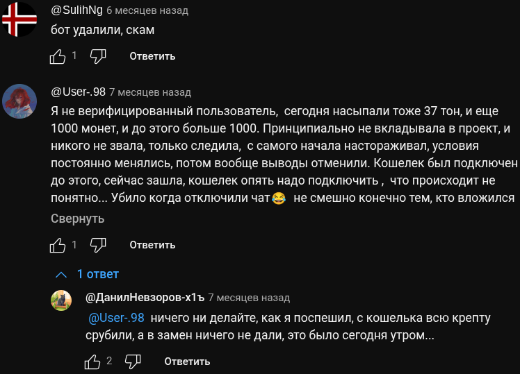 В описании сообщества алгоритм мессенджера указал, что проект получил пометку SCAM из-за большого потока жалоб от пользователей. Во вступительном сообщении разработчики никак не попытались это парировать, а лишь написали про запуск программного обеспечения для майнинга через бот в телеграме.