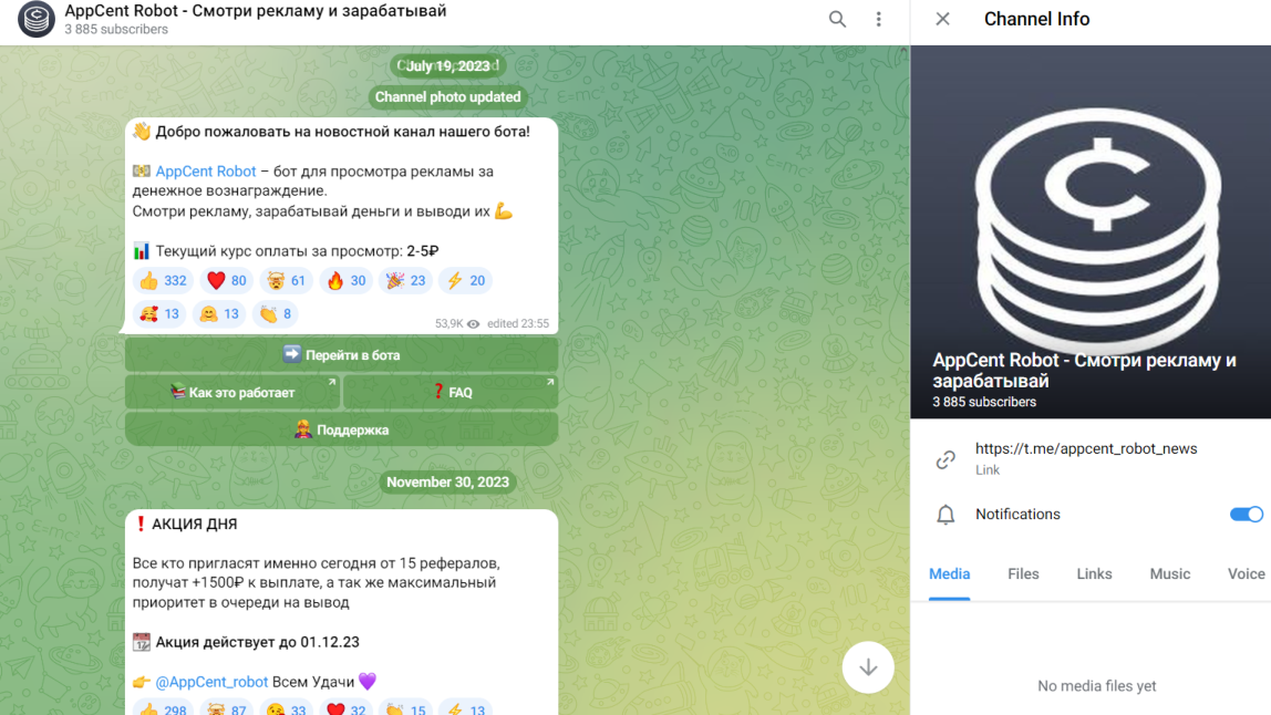 Здесь админы рассказывают о принципе работы с приложением. Также уведомляют об акциях дня. Например, сейчас предлагают приглашать до 15 людей, за что можно получить 1 500 рублей. В качестве контактов обратной связи в Телеграм, оставлена ссылка на страницу поддержки AppCent Help Robot.