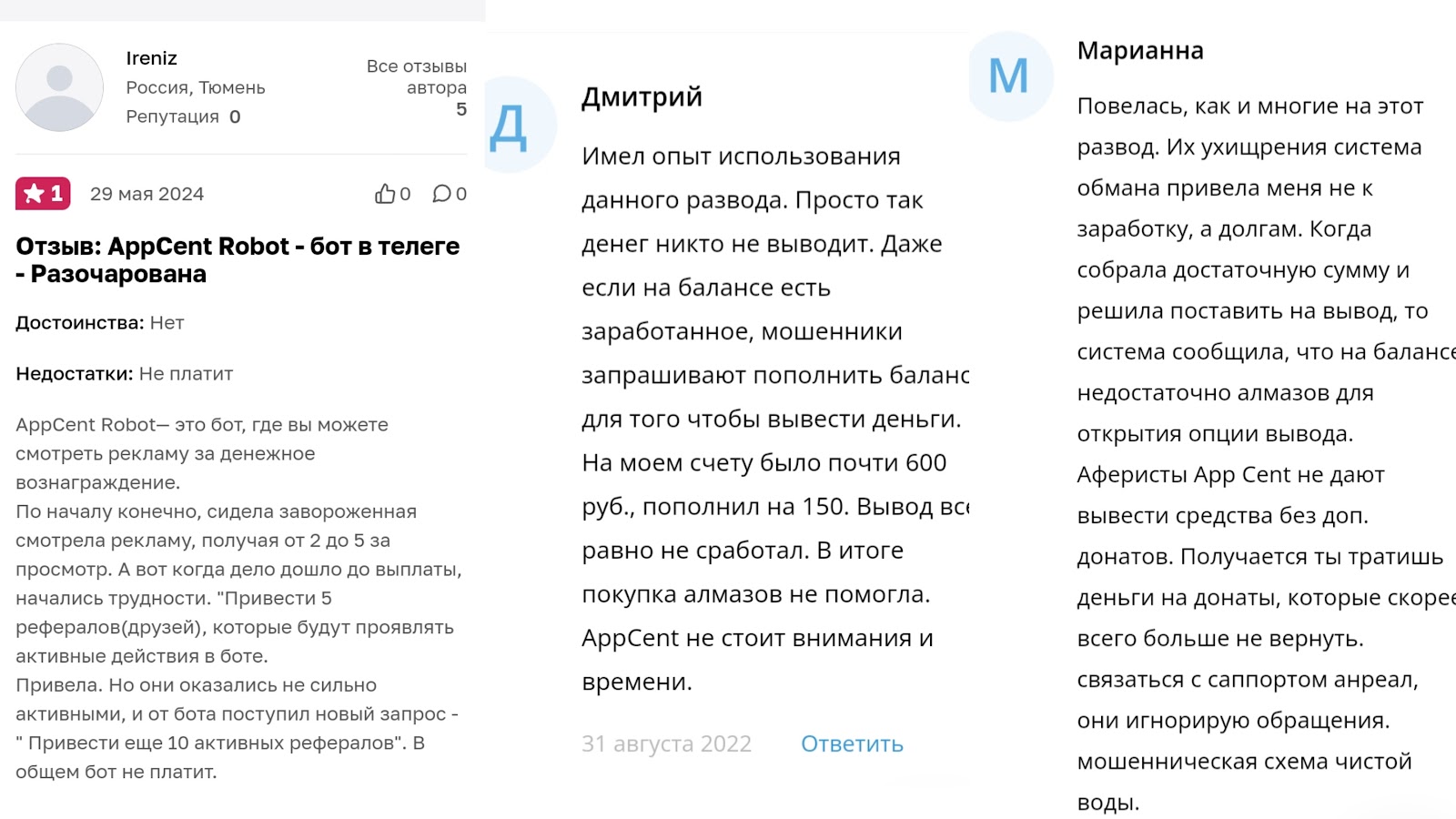 На тематических ресурсах мы обнаружили множество жалоб на проект. Как указывают в отзывах, правда в том, что проект Appcent Robot (bot) в Телеграмме (Telegram) — скам. При выводе средств у пользователей возникают проблемы.