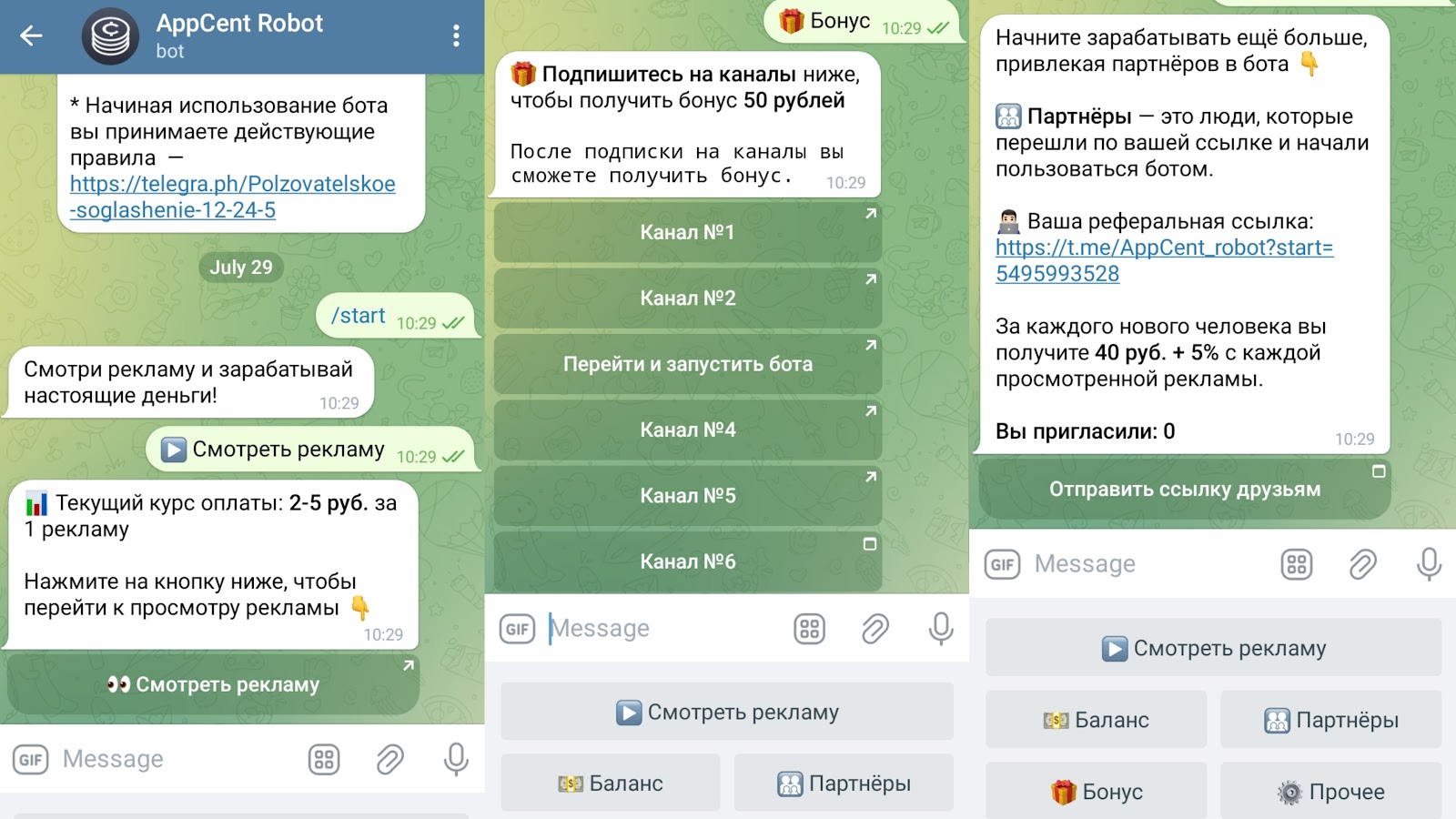 Для того чтобы начать зарабатывать, нужно запустить бота AppCentRobot. Пользователям станут доступны такие разделы: