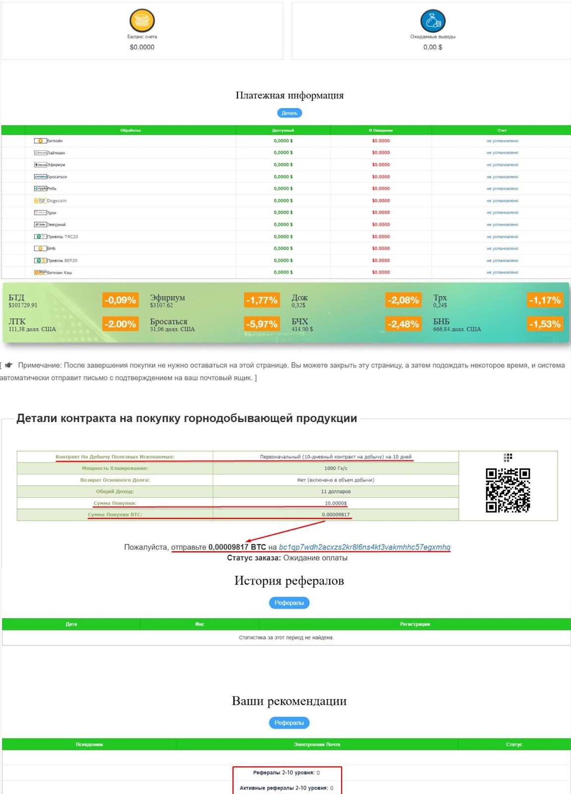 Для пополнения счета клиент может выбрать одну из 12 криптовалют. Например, BTC, USDT, TRX или DOGE, но для перевода в терминале указан неизвестный криптоадрес, который должен быть привязан к аккаунту. Для транзакций не требуется дополнительное подтверждение. В разделе реферальной программы указано о 10 уровнях рефералов, что используется в финансовых пирамидах.