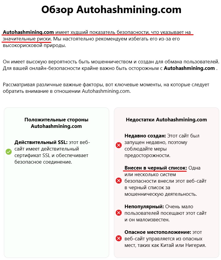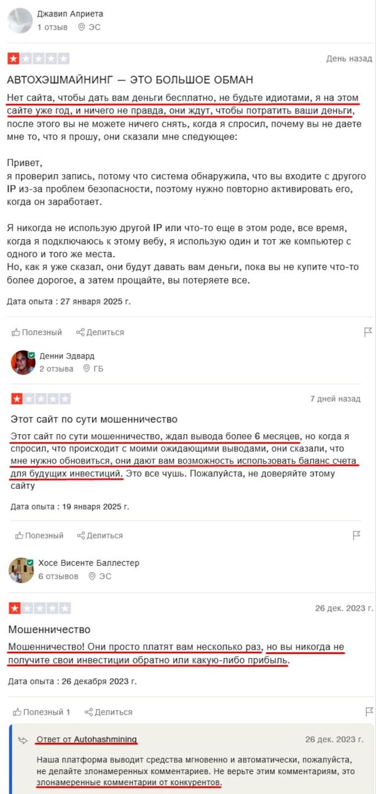 - В обзорах на платформу autohashminingltd отзывы от майнеров негативные. Положительные комментарии пользователей о прибыли выглядят как фейковые;