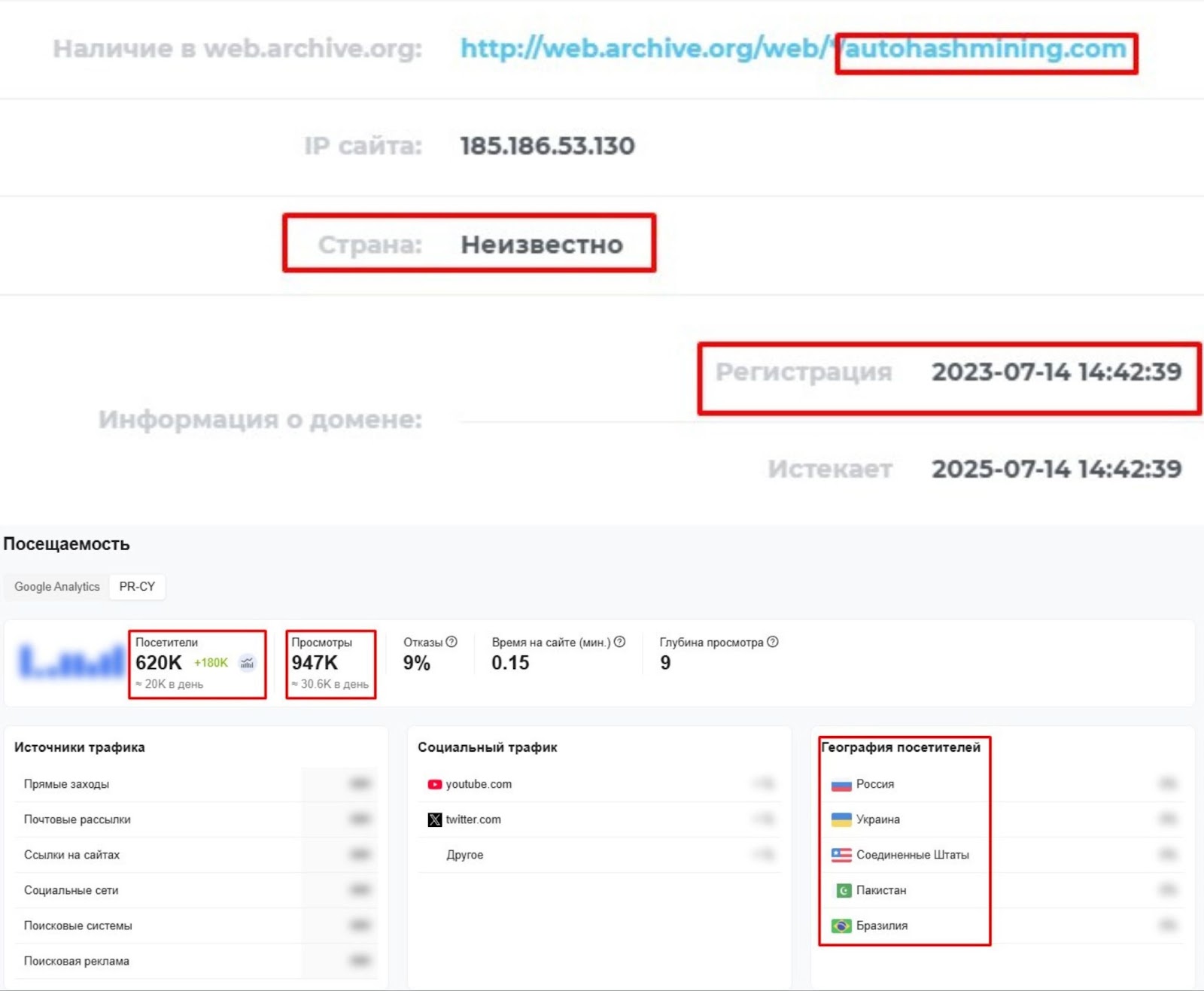 Домен autohashmining com зарегистрирован 14 июля 2023 года. Трафик на сайте достигает 20 тысяч пользователей в день. Посетители платформы в основном находятся в России, США, Пакистане, Украине и Бразилии.