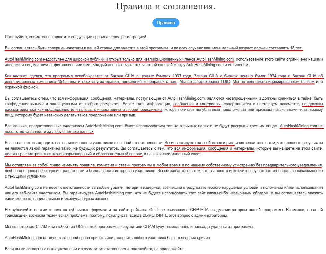 На сайте autohashmining com пользователи могут ознакомиться только с одним регулирующим документом. В соглашении компания указывает, что сотрудничество позиционируется как частная сделка и освобождается от законов США о ценных бумагах. Дополнительно проект снимает всю ответственность за убытки клиентов и сообщает о возможном изменении размера комиссий без предупреждения.