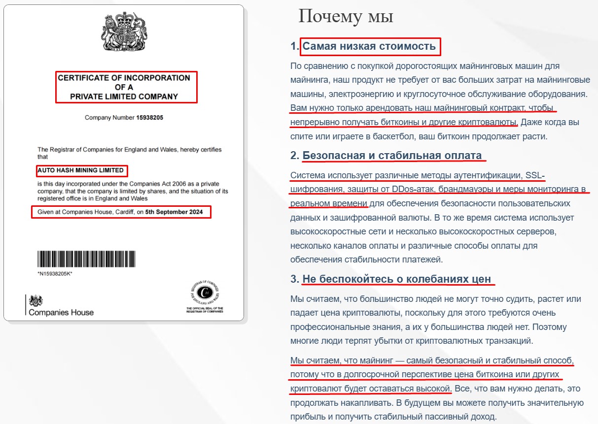 Компания Autohashmining сообщает аудитории о преимуществах услуг, например, низкой стоимости и стабильных выплатах. Но не демонстрирует сравнение с настоящими конкурентами. Дополнительно на сайте указан сертификат о регистрации на финансовые услуги в Великобритании. Однако документ датирован сентябрем 2024 года, что отличается от даты начала официально деятельности autohashminingltd.