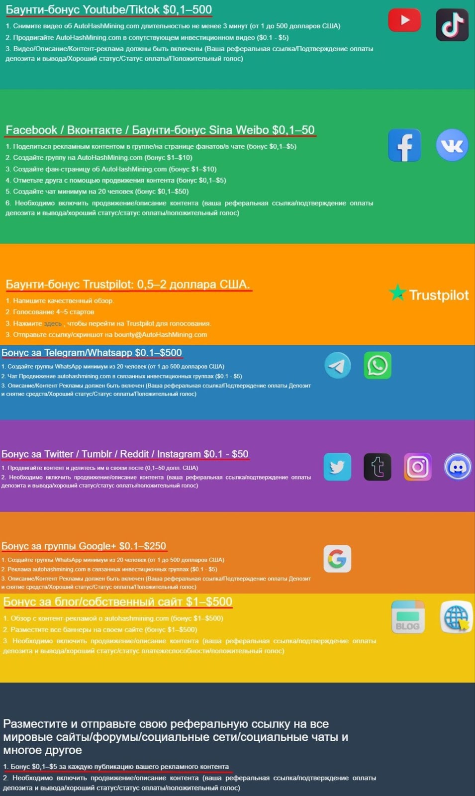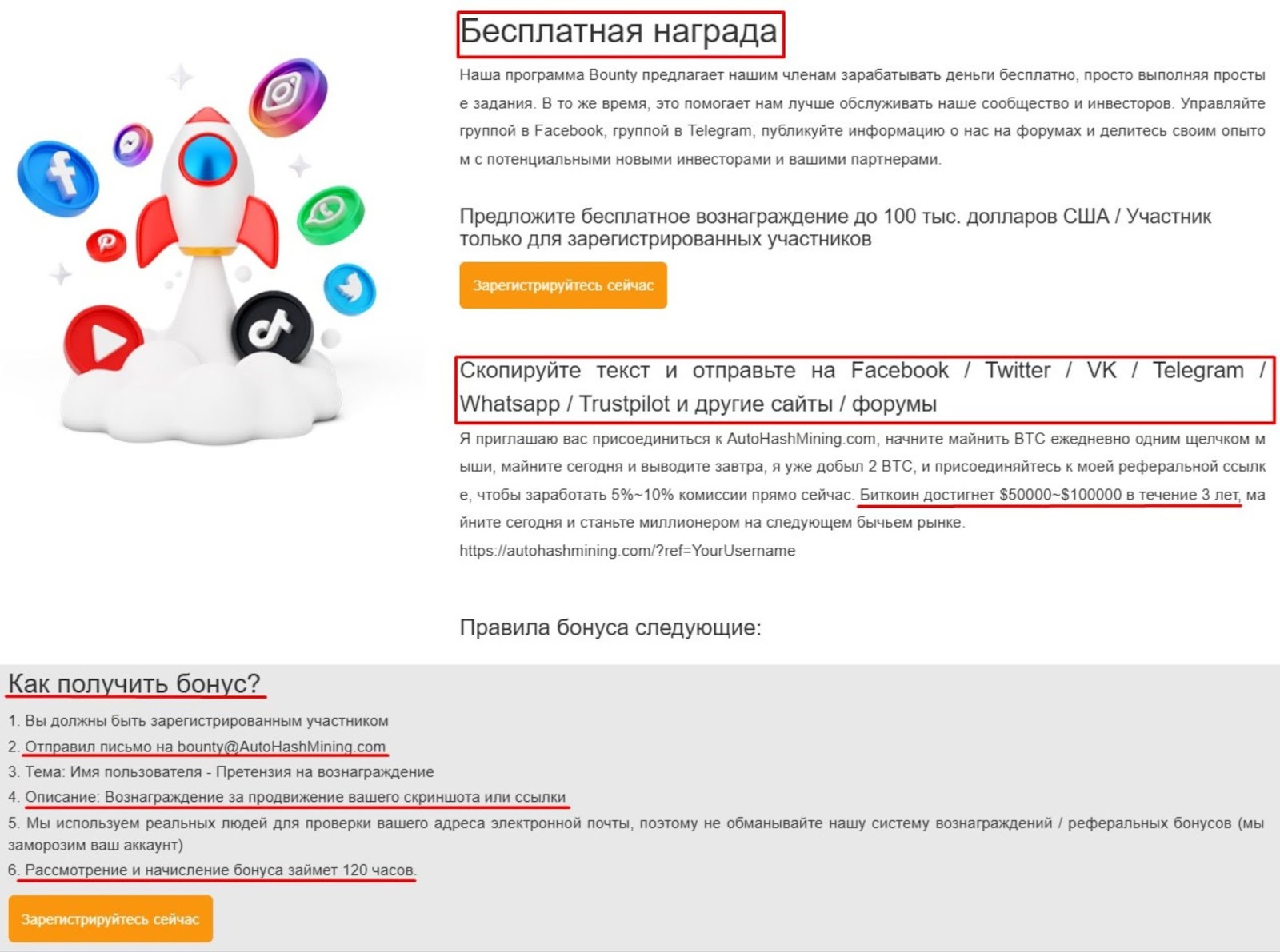 Платформа autohashminingltd предлагает клиентам бонусную программу с доходом до 100 тысяч долларов. Заработок заключается в реферальной программе через соцсети. Клиент может получить вознаграждение за каждого реферала после подтверждения претензии в течение 120 часов.