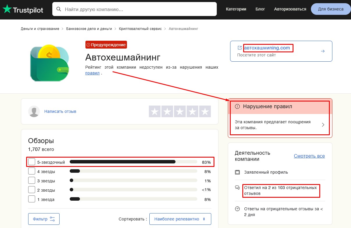 На веб-ресурсе autohashmining com отзывы от майнеров не размещаются. На форумах клиенты оставляют смешанные комментарии. Но активный маркетинг проекта продвигает майнинг-фирму в соцсетях. Например, на известной платформе Trustpilot опубликовано 1707 комментариев, но на странице сообщается о накрутке отзывов за вознаграждение.
