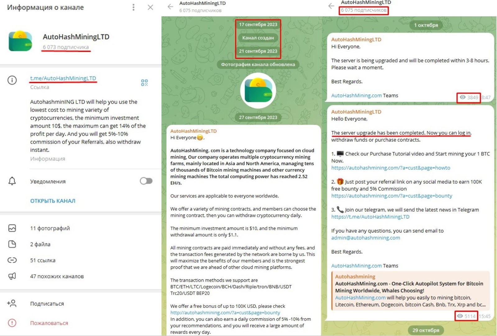Проект autohashmining собрал аудиторию в телеграм для публикации обновлений и рекламных предложений. Канал создан 17 сентября 2023 года, что демонстрирует примерную дату основания компании. В группе 6 тысяч пользователей, но записи набирают 2-4 тысячи просмотров. В публикациях отключены комментарии и реакции, что не дает понять отношение комьюнити.