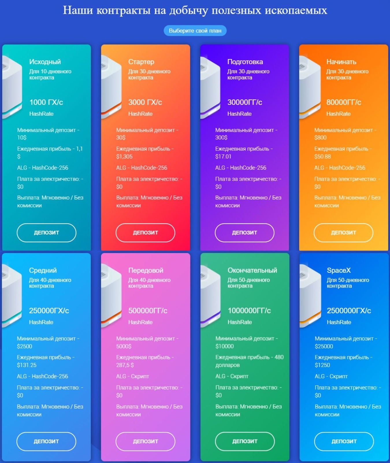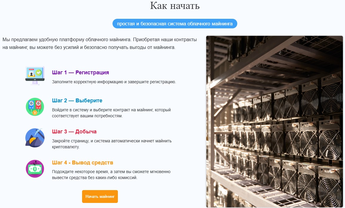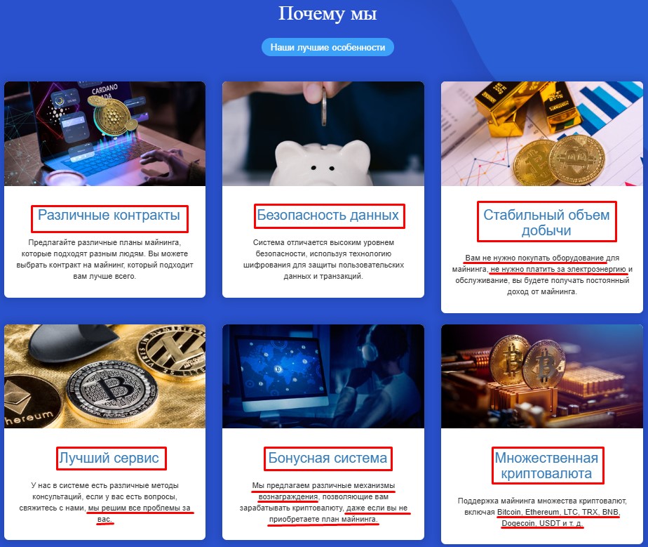 Майнинг-проект позиционирует собственные услуги как лучшие на рынке облачной добычи криптовалюты. Компания демонстрирует выбор различных контрактов, сохранность данных, стабильность заработка и выгодное сотрудничество. Например, доступен майнинг ETH, DOGE и TRX. Дополнительно сервис обеспечивает своевременную техподдержку по вопросам оплаты контрактов и вывода средств.