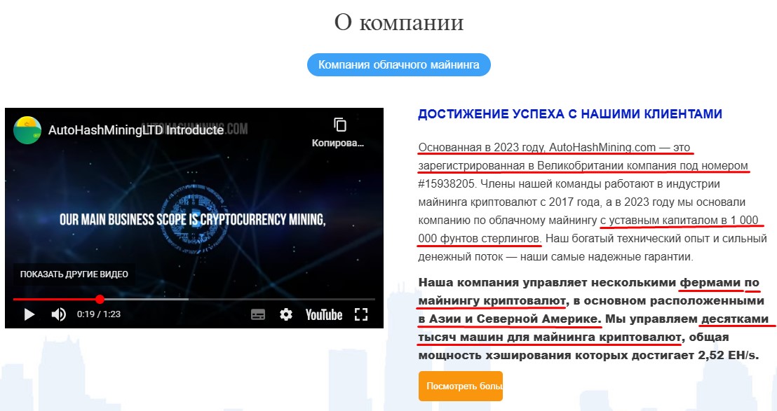 Сайт autohashmining com демонстрирует пользователям данные об основании компании, условиях сотрудничества и платных услугах. На главной странице указано, что проект создан в 2023 году в Великобритании, но конкретная дата не сообщается. В управлении организации находятся майнинг-фермы в Азии и Северной Америке с десятками тысяч машин для майнинга. Однако точные сведения и статистика отсутствуют.