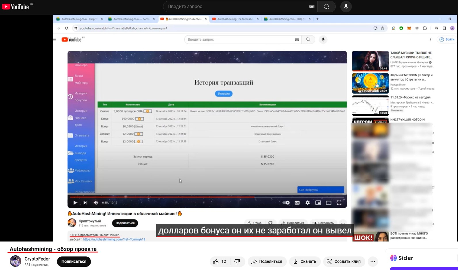На youtube инфлюенсеры публикуют видео обзоры о проекте autohashmining com. Например, майнер демонстрирует сайт проекта и сравнивает личный результат с другим пользователем. В итоге юзер указал на основную доходность от рефералов и частичные проблемы с выводом средств.