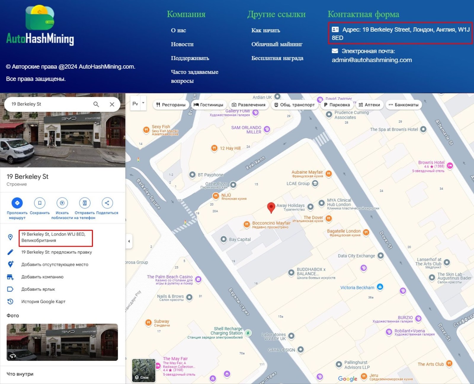По адресу офиса компании в Лондоне отсутствуют сведения о местоположении autohashminingltd. Это означает указание недостоверных данных для сохранения анонимности основателей проекта.