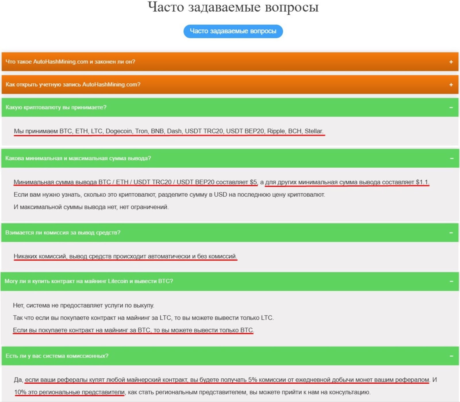 В разделе на сайте с вопросами пользователи могут получить справочную информацию о работе инвестиционного проекта. Например, указано, что минимальный депозит для вывода BTC, ETH и USDT составляет 5$, но остальные криптовалюты можно переводить от 1,1$. Дополнительно сообщается, что региональные представители могут получать до 10% от дохода рефералов, но нужно пройти собеседование.Соцсети проекта autohashmining