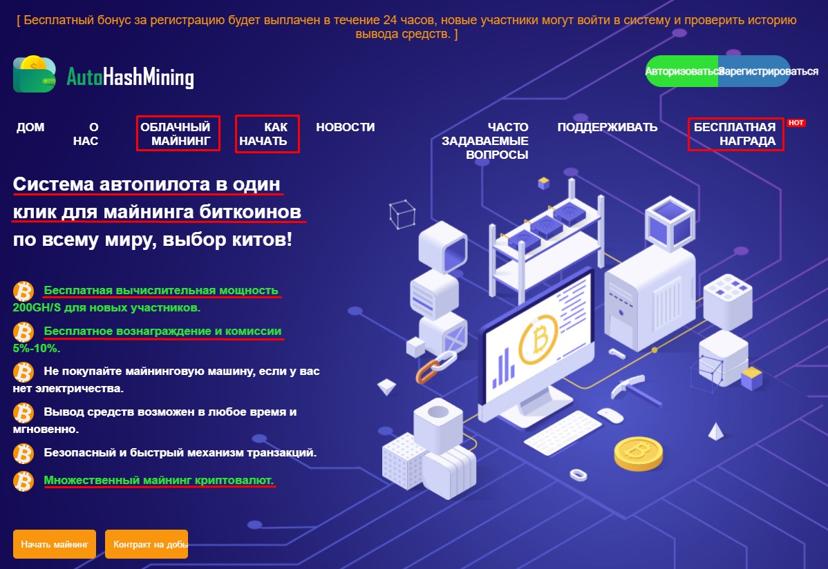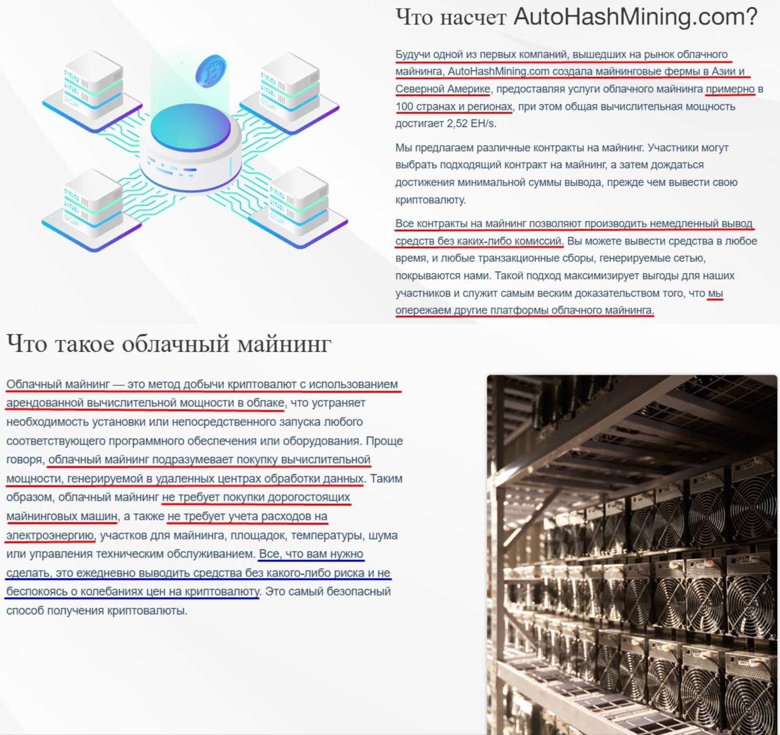На веб-ресурсе autohashmining com сообщается, что проект предоставляет услуги в 100 странах. Облачный майнинг auto hash mining позволяет пользователям добывать криптовалюту без установки оборудования. Сотрудничество заключается в платной подписке на аренду мощностей фермы. Но в описании платных предложений компании клиентам навязчиво обещают прибыль без рисков.