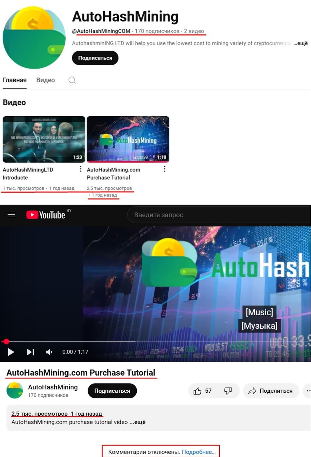 Канал autohashminingcom на youtube создан в сентябре 2023 года. На аккаунт подписано 170 пользователей. В профиле 2 видео с инструкциями. Но комментарии к контенту отключены, что демонстрирует закрытый тип деятельности в соцсетях.