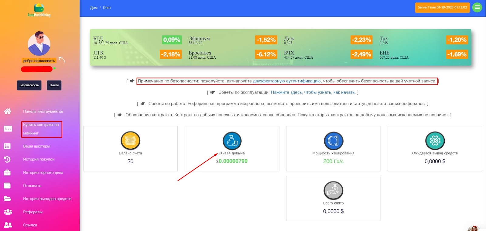 Autohashmining com отзывы от клиентов получает смешанные. Компания занимается облачным майнингом криптовалюты с 2023 года. Проект дает возможность пользователям заработать за счет платных подписок и реферальной системы. Клиентам доступен вывод средств от 1,1$ ежедневно.