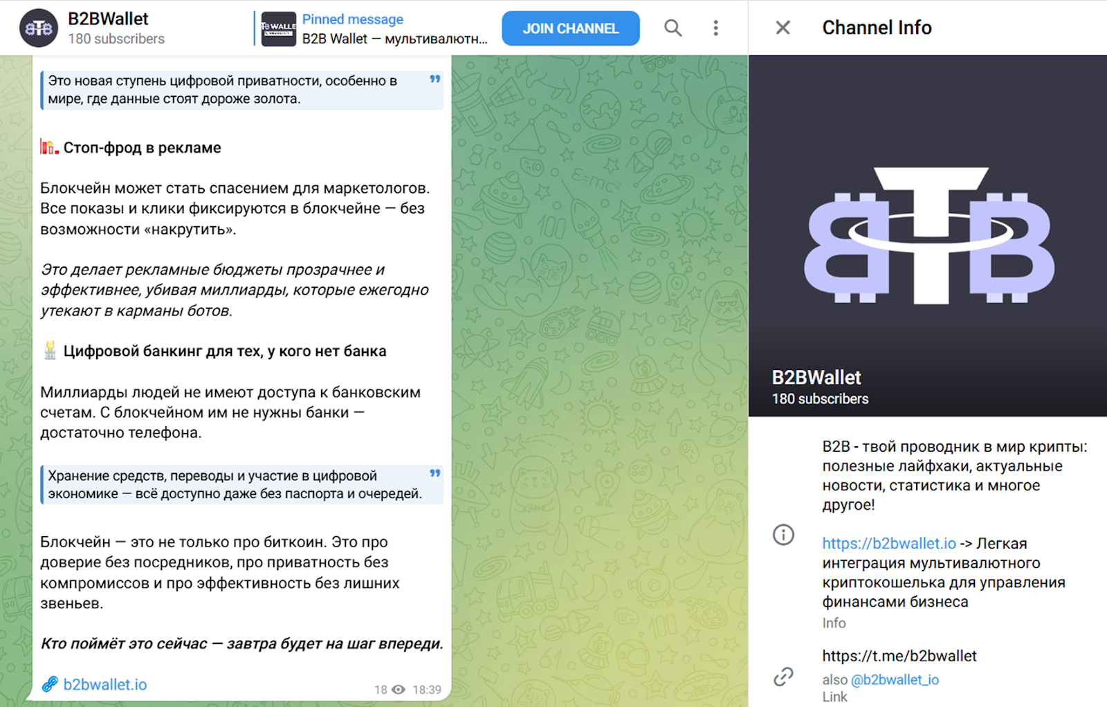 Проект представлен в социальных сетях. В ленте ТГ лонгриды о санкциях, NFT‑музеях и биогазовом майнинге. Под каждым постом маячит ссылка на b2bwallet io. То есть контент играет роль воронки, подогревающей интерес к одноименному сервису-кошельку.