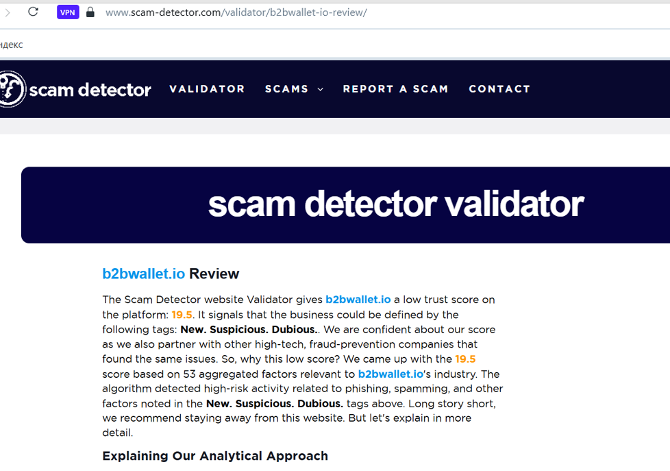 У b2b wallet пока нет ни позитивных, ни негативных пользовательских кейсов в открытом доступе. Только алгоритмические красные карточки от сервисов проверки сайтов. Не ясно как кошелек ведет себя при сбоях, спорных транзакциях и большом объеме нагрузок.