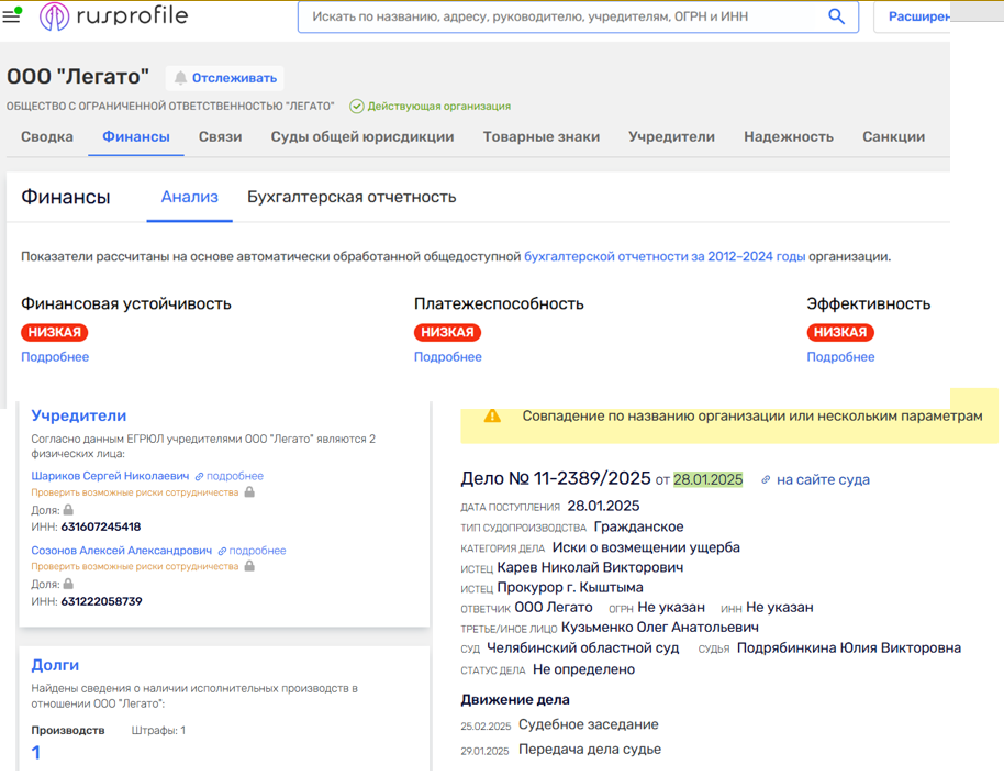 По данным Rusprofile, компания демонстрирует низкий уровень финансовой устойчивости: эксперты отмечают высокий риск просадок по обязательствам и сбои в платежеспособности. В довесок к этому, зафиксировано одно судебное дело, где фирма оказалась в роли ответчика и в итоге оплатила назначенный штраф.