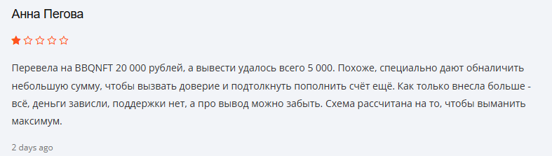В обратной связи клиенты о площадке Bbqnft pro отзываются только отрицательно. Пользователи рассказывают в откликах о классической схеме мошенничества, при которой человеку дают получить небольшую прибыль, а затем блокируют аккаунт.