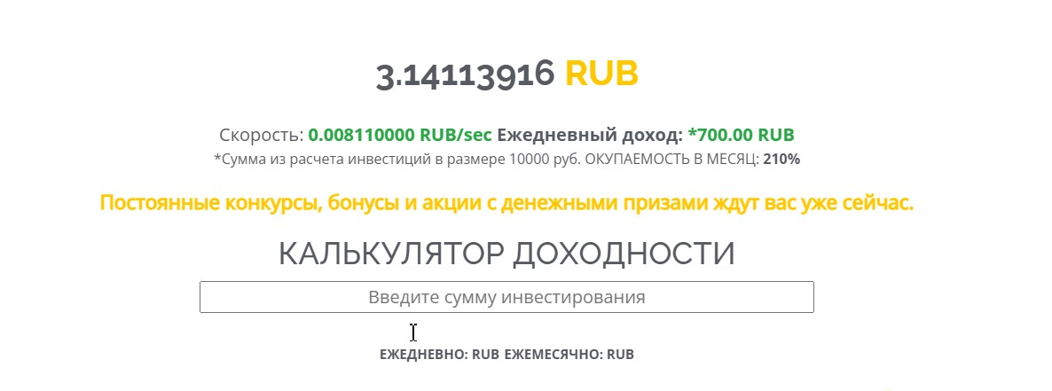 Сразу после регистрации инвестор получает приветственный бонус. Ограничений по вложениям нет. Депозит может быть любого размера. Создатели проекта гарантируют ежедневную прибыль в 7%.