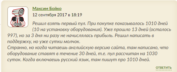 Важное условие – длительный срок заморозки средств. Инвесторы не могут вернуть свои деньги до окончания срока работы оборудования, что повышает риски. Согласно правилам платформы, оборудование работает в течение 1000 дней, а прибыль от добычи криптовалюты автоматически распределяется между участниками, в зависимости от их доли.