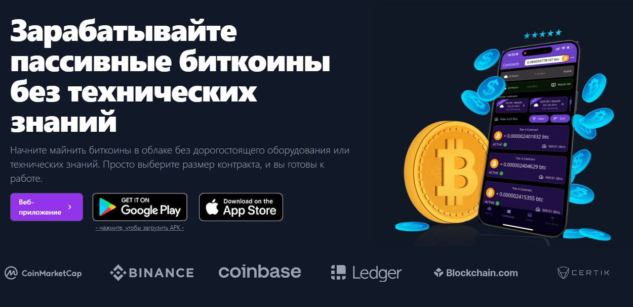 Bitcoin Cloud Mining — приложение для криптомайнинга, которое, по словам разработчиков, позволяет получать высокий доход без использования дорогостоящего оборудования. Оно нацелено на майнеров-трейдеров с небольшими бюджетами.