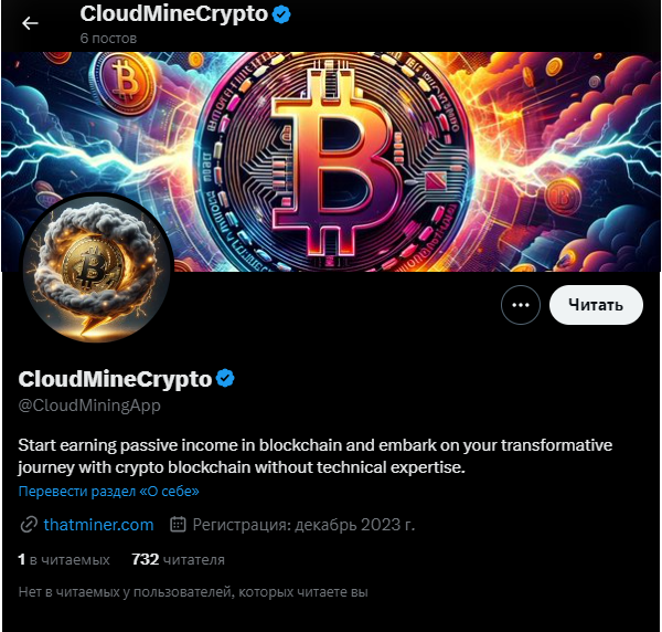 В бывшем Твиттере у компании @CloudMiningApp всего 700+ читателей. Но страница официальная (подтверждена). Публикаций всего 4 (на осень 2024 года), но они имеют по 2+ тысячи просмотров. Скорее всего страницу в Х админы проекта вести не очень хотят, ведь создана она в 2023 году, но никак не раскручивается.