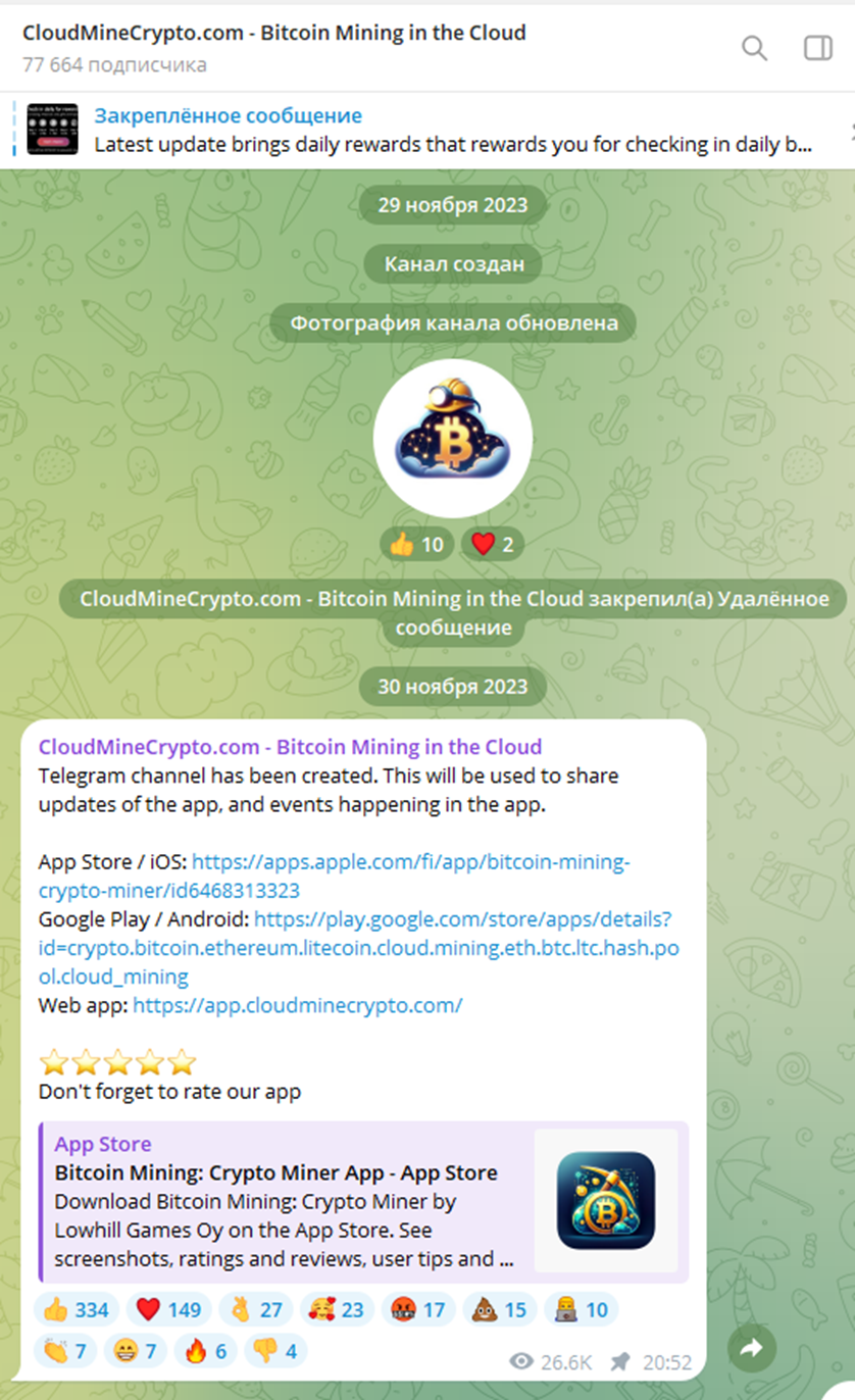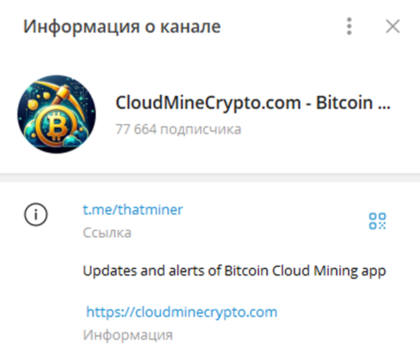 В Telegram Bitcoin Mining Crypto Miner поддерживает работу канала thatminer. Как и сайт, ресурс работает на английском языке. Начало работы обозначено 30 ноября 2023 года и сейчас здесь более 77 тысяч подписчиков. Количество просмотров каждого сообщения значительное, доказать накрутку невозможно. Комментарии закрыты, но реакции не запрещены и далеко не все из них положительные. В основном здесь постят котировки биткоина и сообщают об очередном росте, но сообщения появляются не часто и ситуации падения курсов не освещают, показывая исключительно нужную динамику для создания оптимистичной картины.