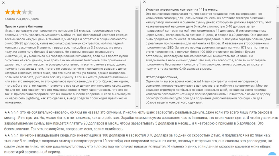 Отзывы о Bitcoin Mining Crypto Miner можно найти самые разные. Те, кто восхищаются проектом, не приводят доказательств реального заработка. А те, кто пишет о реальных выплатах подтверждают то, что отбить даже половину от вложенных средств нереально, не то, что заработать.