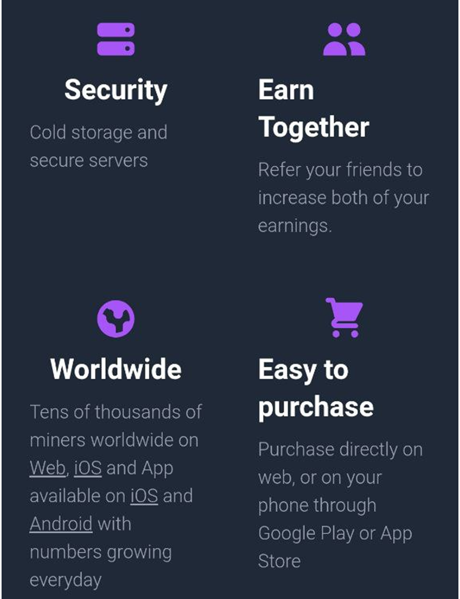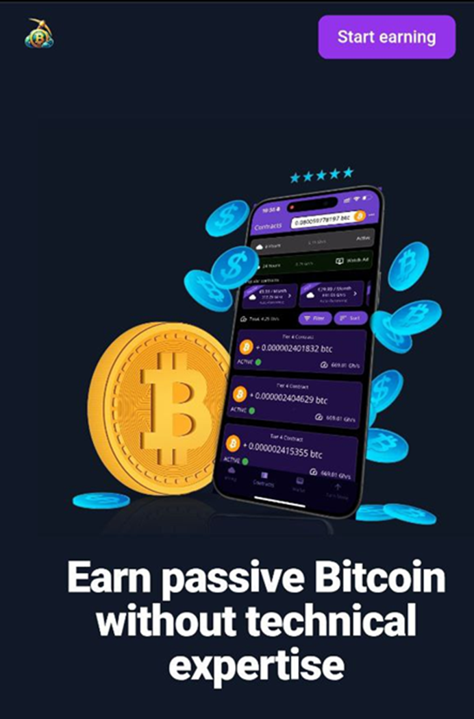 Разработчики Bitcoin Mining Crypto Miner утверждают, что без необходимости значительных вложений в специализированное оборудование можно начать майнить BTC. Допустимо стартовать с заключения бесплатного контракта, чтобы попробовать свои силы. Есть реферальная программа. Обещают следующие преимущества:
