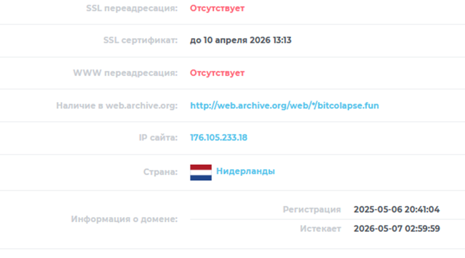 Проверка сайта показала, что домен был зарегистрирован в первой половине 2025 года через нидерландский адрес. Но старт проекта прошел незаметно, особого интереса он не вызвал. Посещаемость на сайте очень низкая. В мае 2026 срок действия домена истекает. Сомнительно, чтобы владельцы ресурса продолжили его работу.Отзывы