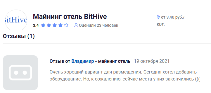 Например, на одном из агрегаторов майнинговых сервисов 23 пользователя оценили предлагаемые услуги, на основе чего появился рейтинг 3.4 балла из 5. Однако полноценный отзыв с комментарием здесь всего один, где сервис хвалят, но отмечают отсутствие свободных мест в контейнерах.