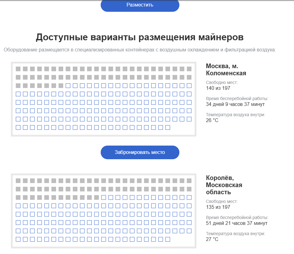Основная услуга сервиса — аренда мест в специально оборудованных охлаждением и фильтрацией воздуха контейнерах в Москве. Всего доступны три площадки по 200 мест под майнеры. На сайте отображается статистика по свободным местам, температурой внутри и временем работы с момента последнего перебоя/перезагрузки.