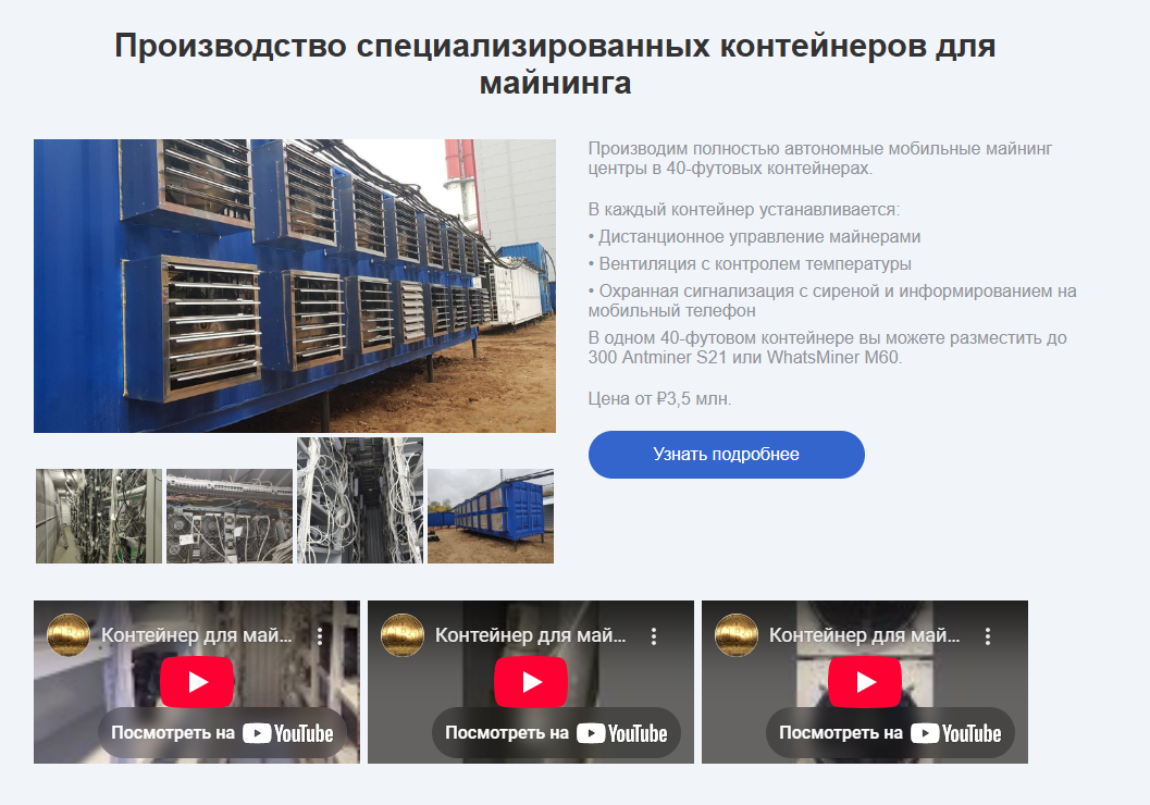 Но есть и два дополнительных предложения от БитХайв. Во-первых, разместить в контейнерах можно и личное оборудование, и купленное у самой компании. Во-вторых, создатели стартапа готовы под ключ обустроить готовый отдельный контейнер под нужды клиента.