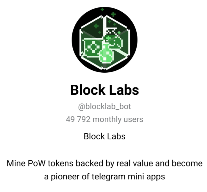 Block Labs — Телеграм-бот, позволяющий добывать токены по принципу PoW с помощью мобильного телефона. Майнинг возможен без покупки оборудования и настройки. Игроки могут оптимизировать возможности, увеличивать скорость добычи и получать до 15% от привлеченных пользователей. Ниже подробно разберемся, насколько перспективным является проект, и стоит ли тратить на него время.