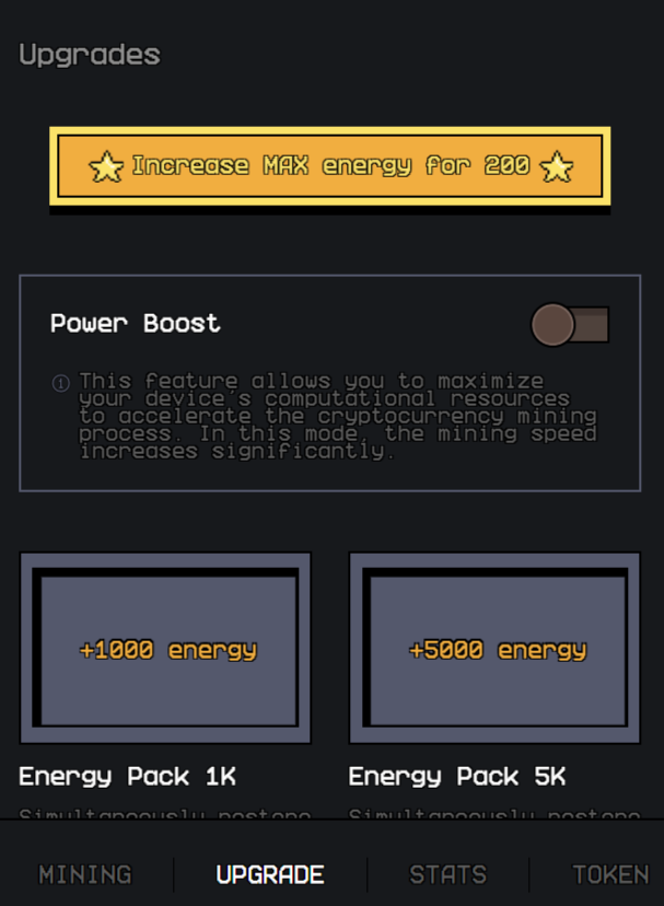 В нижем меню есть раздел Upgrade (Улучшения). При входе в него можно активировать оптимизацию мощности и таким способом повысить эффективность добычи. В частности, +1000 энергии можно купить за 50 звезд, а 5000 — за 200. Здесь пользователям предлагают привлечь новых клиентов и получить за это дополнительную награду.