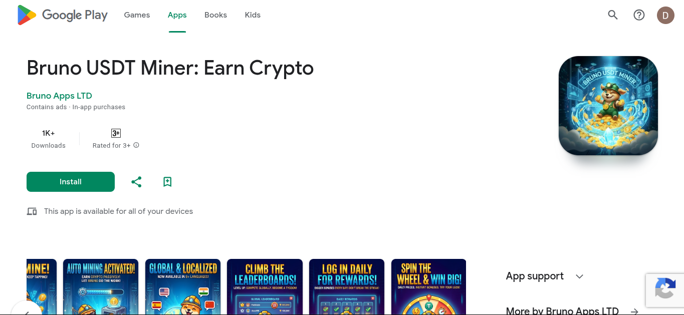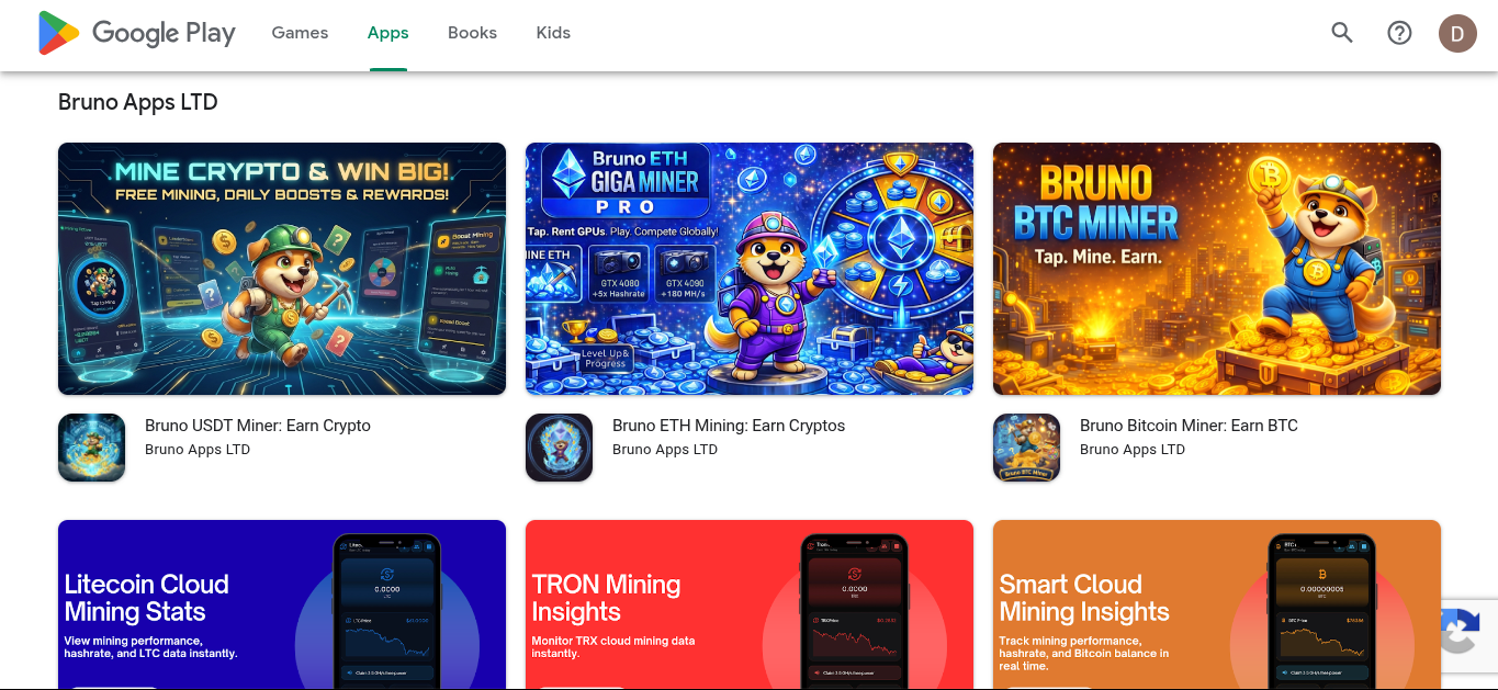 Проект «Бруно Юсдт Майнер» есть только на базе платформы GooglePlay. Разработчиком выступает компания Bruno Apps LTD. В ее портфолио еще 4 схожих проектах: Litecoin Mining, Ton Cloud Mining, BTC Cloud Mining, ETH Cloud Mining.