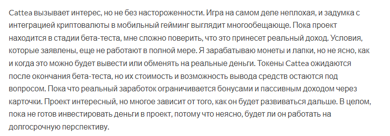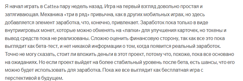 Однако, в Сети нашлись и более подробные мнения от тех, кто только начал свой путь в проекте Cattea. Эти пользователи оценивают перспективы игры достаточно высокого и отмечают интересный геймплей. Какие-либо негативные комментарии нам обнаружить не удалось. Хотя некоторые игроки и упоминают о том, что не забывают об осторожности, хоть и верят в проект.