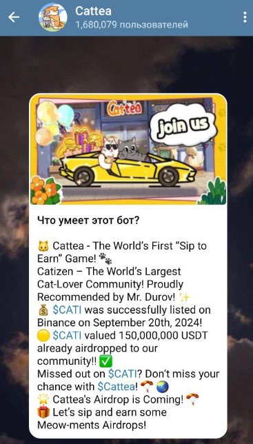 В настоящий момент данное мини-приложение фиксирует более 5 миллионов пользователей ежемесячно, обладает собственной веб-платформой и внутренним токеном 一 $CATI. Игра была отмечена даже Павлом Дуровым, о чем напоминает при запуске и бот Cattea.