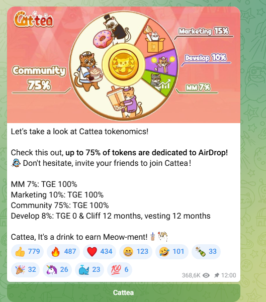 Проект в тг Cattea создает о себе более, чем приятно впечатление. Как минимум тем, что обещает раздать 750 миллионов уже существующих токенов $CATI. Неудивительно, что это всего за 2 недели привлекло в игру более 1,5 миллионов пользователей. Однако, пока остаются неизвестными точные условия участия в аирдропе и его дата, мы рекомендуем не забывать об осторожности.