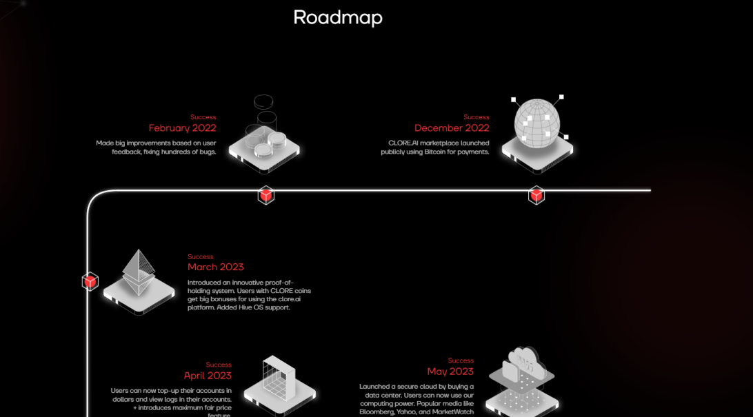 • 2023 год. Была внедрена инновационная система подтверждения наличия денег. Было запущено безопасное облако, функция выбора ОС-профилей. В июле появилась функция Clore Mining, добавлены дополнительные опции. Осенью появились обновления в MFP, монета CLORE стала методом оплаты. Далее прибавились приватные контейнера и объявлены партнерства с компаниями;