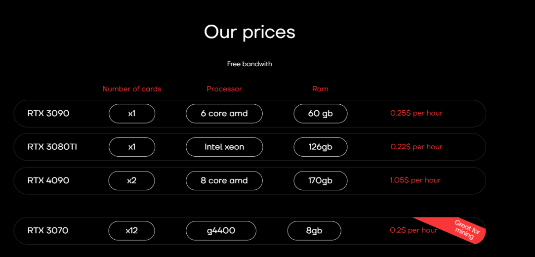 Компания предлагает разные услуги. Клиенты могут использовать GPU для обучения ИИ. Процессоры GPU разрешают создавать видео высокого качества. Также майнеры могут добывать криптовалюты, арендовав процессоры. Часовая стоимость следующая: