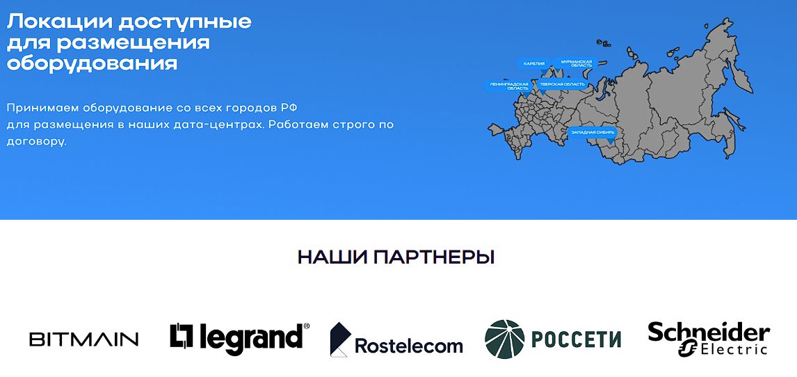 Сервис «Кластер Майнинг ком» работает с 2017 года и официально зарегистрирован в Москве. Дата-центры компании тоже в России – в Карелии, Западной Сибири, а также Мурманской, Ленинградской и Тверской областях.