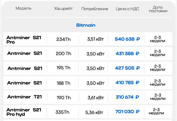 В нем пользователи найдут цены и сроки доставки майнеров в разные регионы РФ.